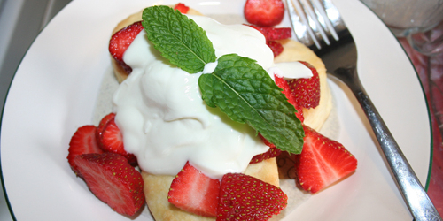 | 5. Sort-of-strawberry shortcake for breakfast (biscuits I made, some early California strawberries, vanilla yoghurt and a little bit of mint from our balcony). |