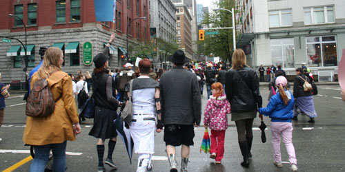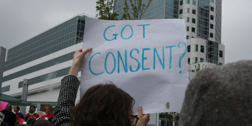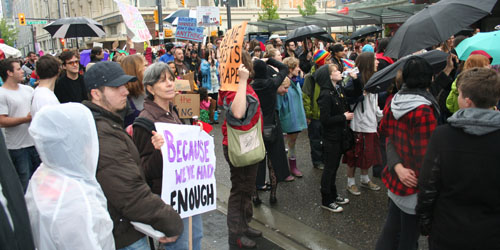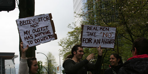 As I mentioned last week, I attended Slut Walk Vancouver on Sunday. It was more than I could have hoped for. Thousands of people (I think, I’m terrible at estimating attendees) showed up and all kinds of different people. I was especially impressed by the number of men that attended and by the amount of people who brought their kids. I should have had more faith that men and families and all kinds of people would turn out, but I’m so glad so many people came. I hope that through the news stories about it and through the observations of the bystanders that watched us march, the message is getting across: no means no, regardless of what you’re wearing, your behavior, and your environment.