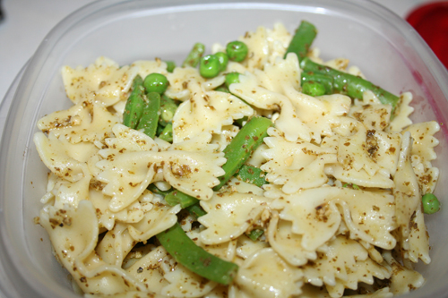 | {Pasta salad, ready for a train picnic.} |