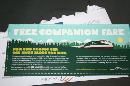 | {After filling out a survey and forgetting about it I received this in the mail from Amtrack. It’ll come in very handy for a potential upcoming trip to Seattle.} |