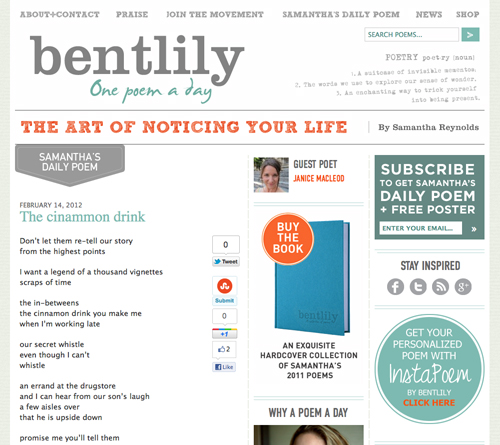 Wander over to bentlily and take a look. You’ll find guest poets, the fun InstaPoem, a forthcoming book and of course, a poem a day. Let me know what you think!