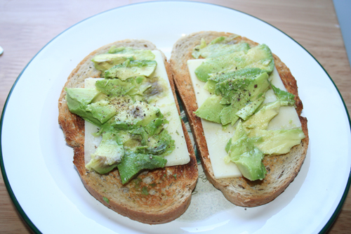 | {My breakfast of choice lately, which is bordering on an addiction: toast with avocado, cheese, salt and pepper and a bit of lime juice.} |