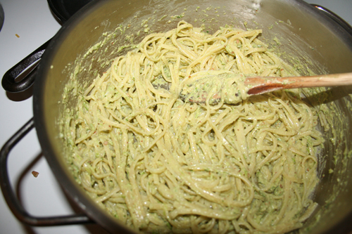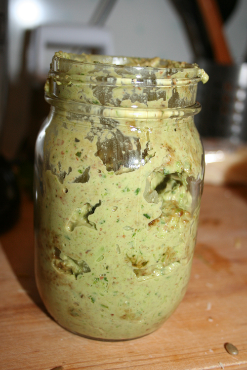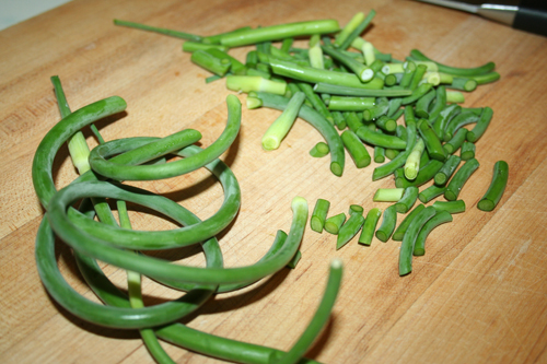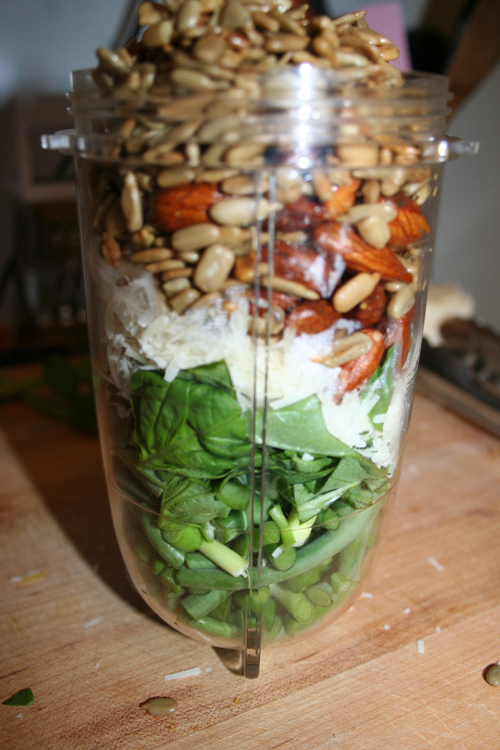 Ever since I saw this post on reading my tea leaves, I’ve been wanting to try garlic scape pesto, so when I saw garlic scapes at the farmers’ market a week ago I jumped on them. (They were cheap, to boot!) On the recommendation of the guy who sold them to me I added some sunflower seeds which I toasted with some almonds. I also added some basil because it’s delicious! They combined into a delicious paste which I can’t get enough of. Seriously. Best. Thing. Ever.