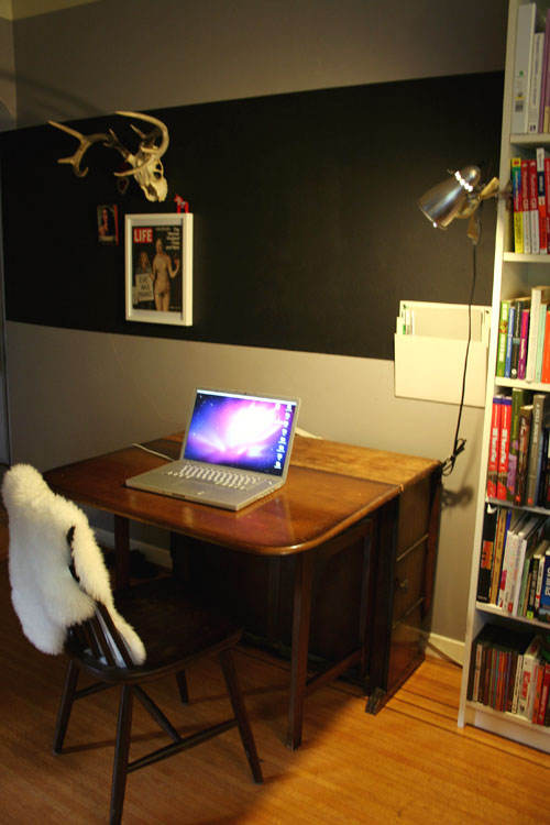 I wanted to make my section of the room seperate from the rest living area and from N’s office. I’ve always wanted to use chalkboard paint so I decided that this would be the project! On the weekend, I painted a one-metre strip of chalkboard paint above my desk and added a few of my favorite pieces of art from around our apartment. I’m hoping to add a few small things to the wall collection but for now I think the art chunk in the middle of the chalkboard breaks the stripe up pretty nicely. (The left side is close to our front door so will work well for notes and grocery lists and the like.) Though it might seem a little strange to have a deer skull hanging in our living room, it gives us a touch of Alberta (home) which I’m pretty fond of.