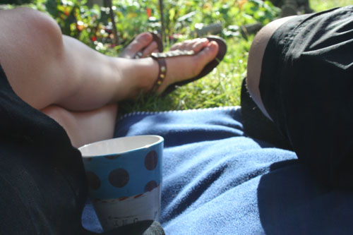 {Relaxing outside with a cup of beer, the sun and N.}