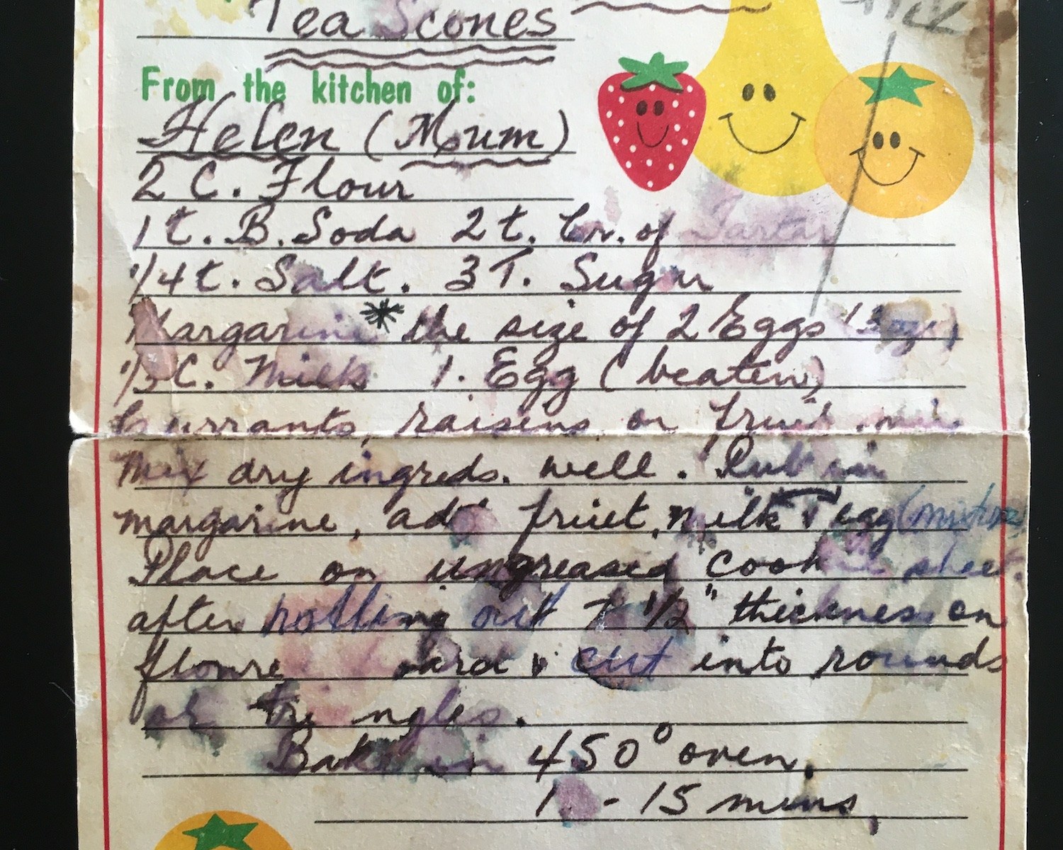 450 degree oven, 12-15 mins baking time 2 cups white flour1 teaspoon baking soda2 teaspoons Cream of Tartar1/4 teaspoon salt3 Tablespoons sugarMargarine the size of 2 eggs (3/4 of a stick of unsalted butter or about 125 ml/1/2 cup)1/3 cup of milk1 egg, beaten (add to milk)black currants or raisins, about 1/4 cup but enough so that …